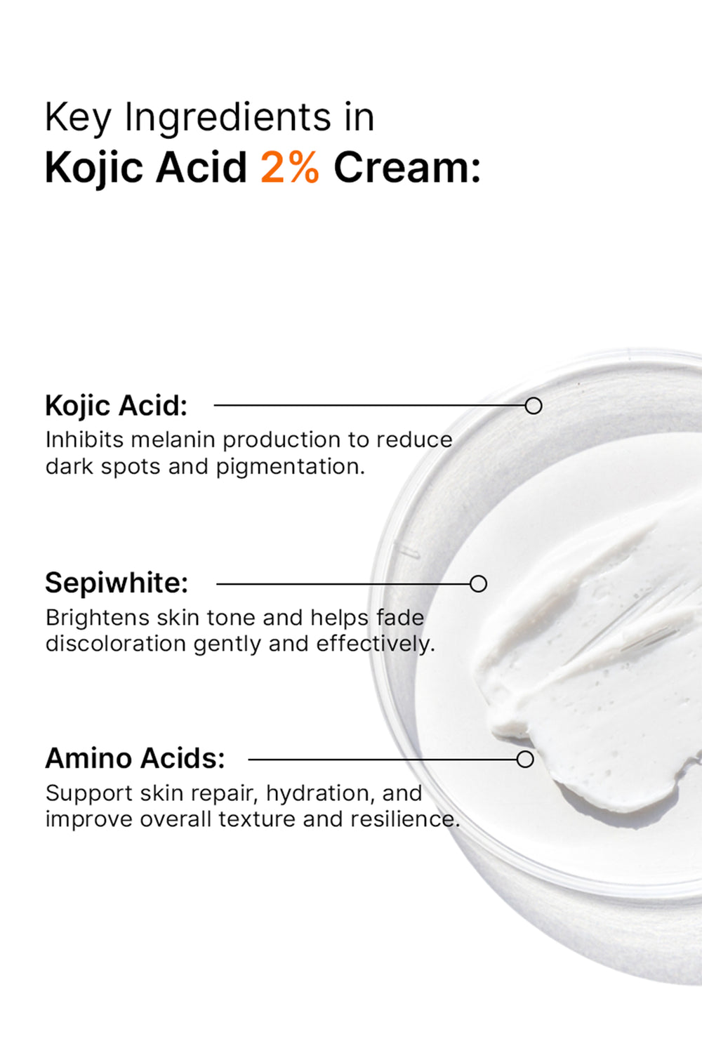 Kojic Acid 2% Cream โ Formulated with Kojic Acid, Sepiwhite, and Amino Acids, this targeted cream helps reduce dark spots, uneven skin tone, and discoloration. With daily use, it promotes a clearer, brighter, and more even complexion.