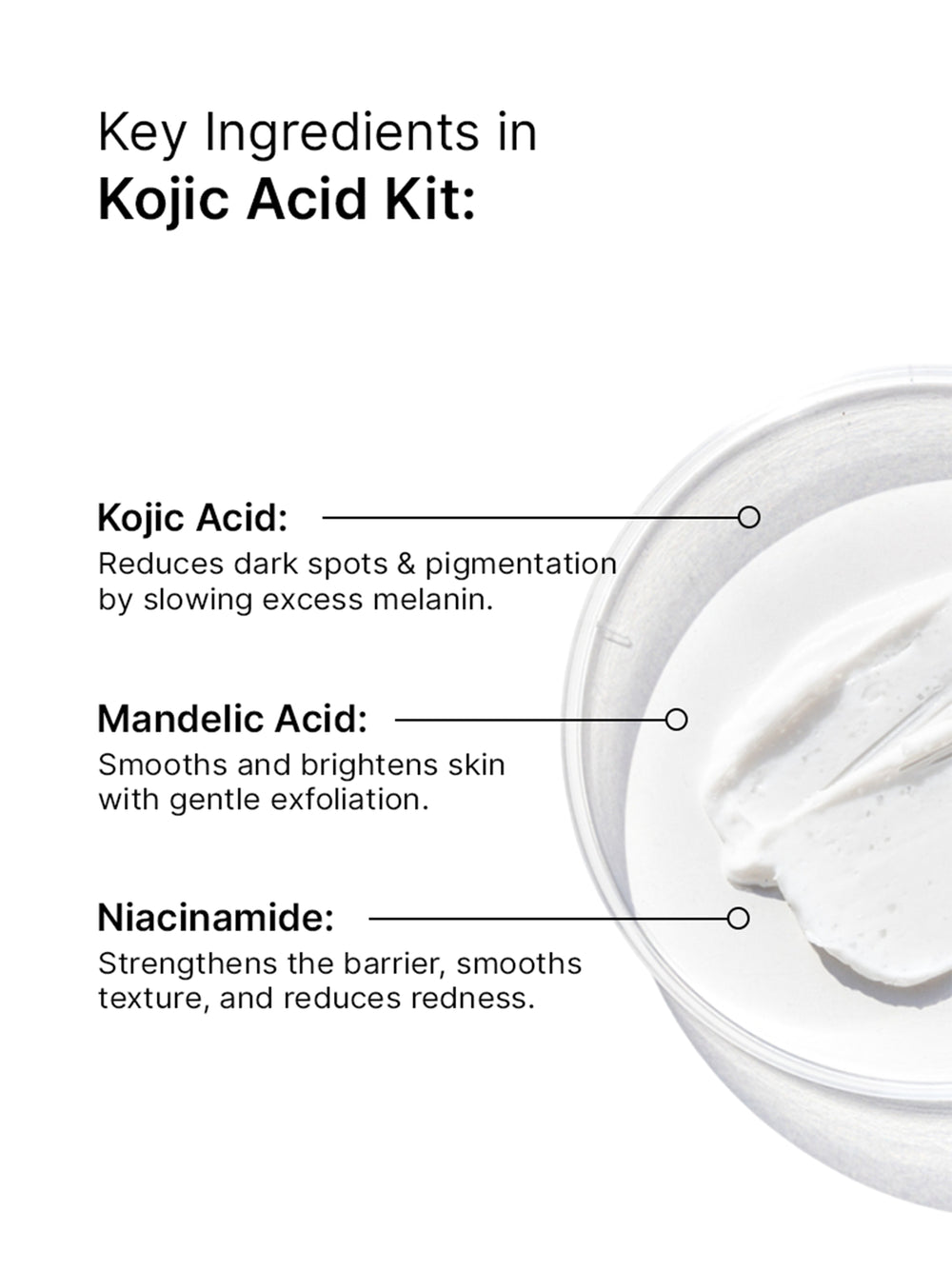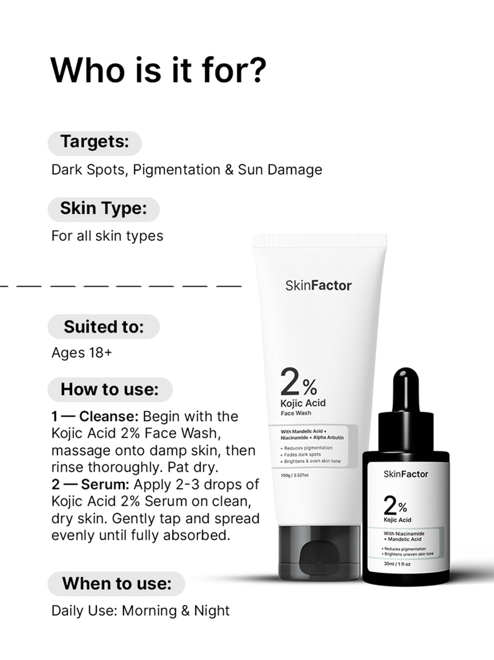 Kojic Acid Brightening Duo โ A targeted routine with Kojic Acid 2% Face Wash and Kojic Acid 2% Serum to help fade dark spots, reduce pigmentation, and even out skin tone. Delivers a clearer, brighter, and more radiant complexion with daily use.