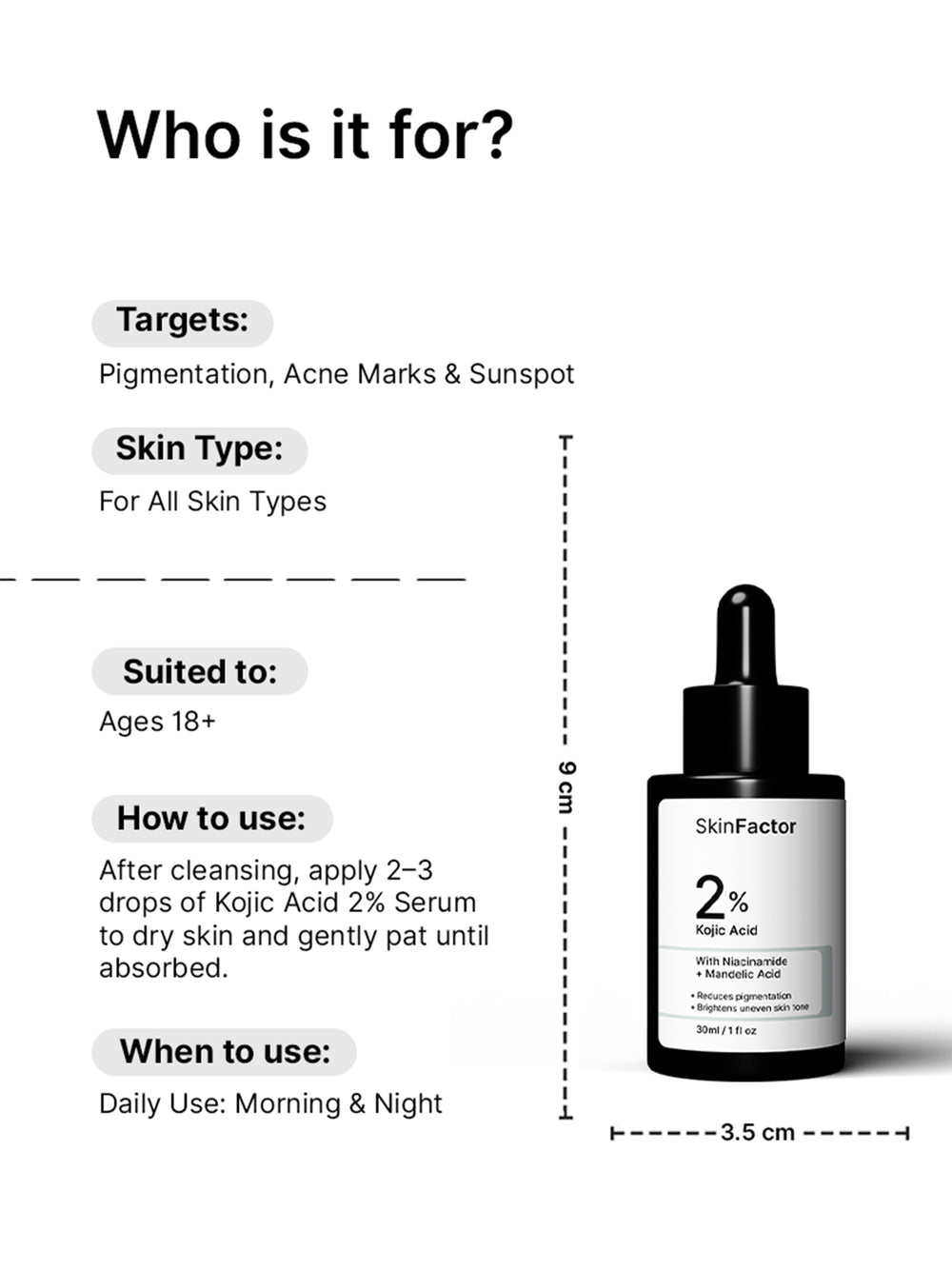 Kojic Acid 2% Serum helps reduce pigmentation, fades dark spots, and improves overall skin tone for a brighter complexion.