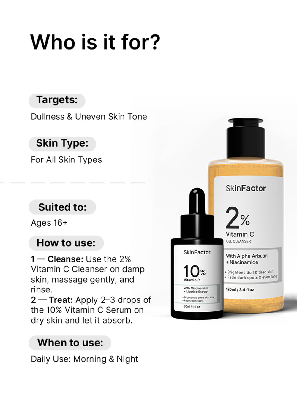 Vitamin C Brightening Duo – A daily routine with Vitamin C 2% Face Wash and Vitamin C 10% Serum, enriched with Niacinamide and Alpha Arbutin. Together, they gently cleanse, brighten dull skin, fade dark spots, and even out skin tone — leaving your complexion radiant, smooth, and healthy-looking.