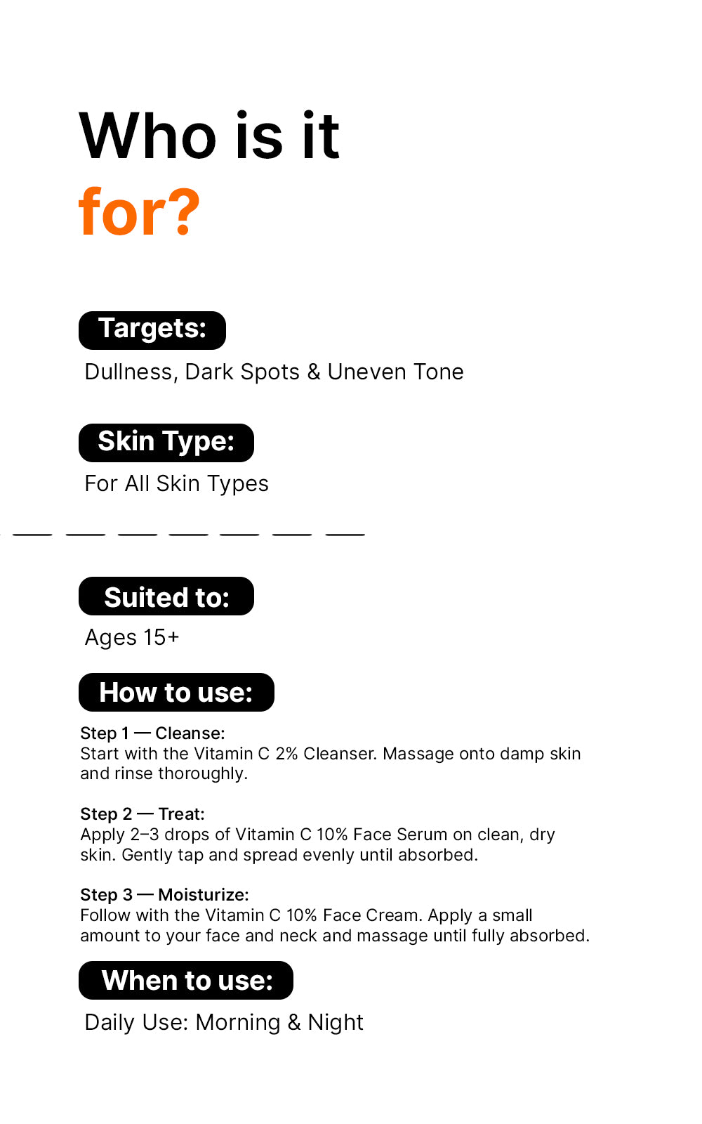 Step 1: Cleanse (AM & PM daily) Use the Vitamin C 2% Face Wash on damp skin. Massage gently, then rinse thoroughly.