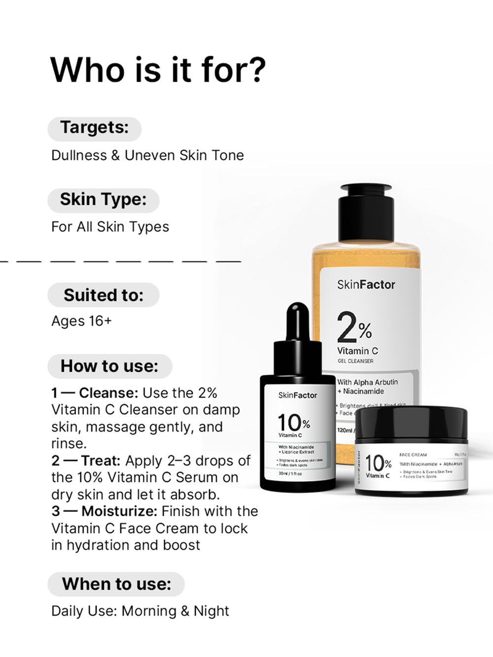 Vitamin C Brightening Kit – A complete glow-boosting routine with Vitamin C 2% Face Wash, Vitamin C 10% Face Serum, and Vitamin C 2% Face Cream. This trio works together to brighten dull skin, fade dark spots, and even out skin tone, leaving your complexion radiant, smooth, and healthy-looking with daily use.